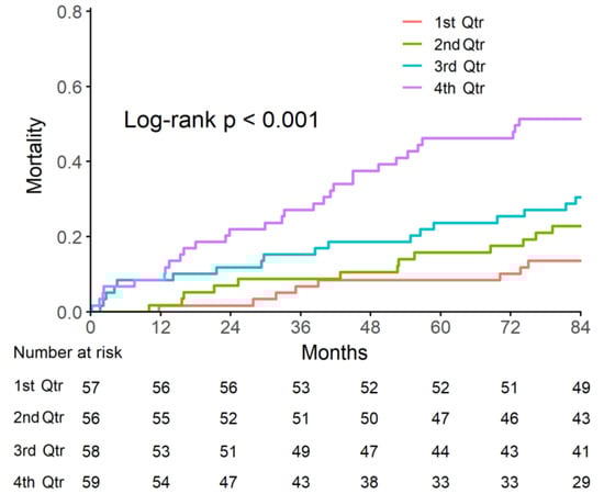 Because serum sTREM2 levels are not associated with either the extent of coronary atherosclerosis or cardiac risk factors, we assessed if sTREM2 is an independent predictor of mortality in CAD patients. During our follow-up, 81 deaths were observed. sTREM2 levels were categorized into quartiles. In the lowest sTREM2 quartile group, eight patients died after seven years (14% mortality). In contrast, 30 patients in the highest quartile group died (51% mortality). The Kaplan–Meier curve indicates that higher sTREM2 levels were significantly associated with a 7-year mortality rate (Figure 3).