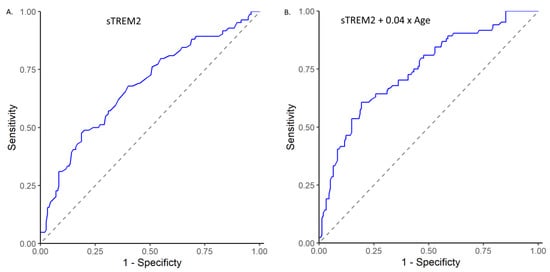 ROC curve representing area under the curve, sensitivity, and specificity for mortality based on log sTREM2 levels alone (A) or on linear combination of sTREM2 with age (B).