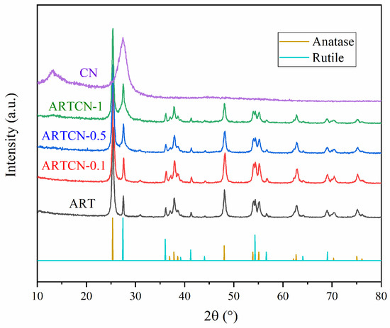 Figure 1 shows the XRD patterns of the prepared samples. We found that ART contained not only the characteristic peaks of the anatase phase but also the characteristic peaks of the rutile phase, indicating that it was a mixed crystal type, which was the prepared (A-R)TiO2 catalyst. CN had a weak diffraction peak near 13.1°, corresponding to the (100) crystal plane of CN, which was formed by the 3-S monotriazine structural unit of the plane []. There was a strong diffraction peak at 27.50°, which was caused by the layered accumulation of graphite in the conjugate plane. The diffraction peak of the ARTCN-X composite corresponded to pure ART, which indicated that CN did not enter the ART lattice and was only attached to its surface. There was no diffraction peak in the composite samples of ART and CN at 13.1°, because the amount of CN was small and had a weak peak. Although the peaks of CN at 27.50° and R-TiO2 at 27.45° coincided, we observed that as the composite ratio increased from 0.1 to 1, the composite gradually widened around 27°, indicating that the composite material was successfully prepared.