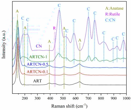 The crystal form and structure of the catalyst were further determined by Raman spectroscopy, and Figure 2 shows the Raman spectra of the prepared catalyst. The anatase phase of TiO2 corresponded to ν = 144 cm−1, ν = 197 cm−1, ν = 392 cm−1, ν = 514 cm−1, and ν = 635 cm−1 [], while ν = 437 cm−1 corresponded to rutile TiO2. The reason why other characteristic peaks did not appear was that the content of rutile in ART was low (as indicated by the peak intensity of XRD). ART and composite ARTCN-X both had anatase and rutile peaks, especially the CN peak of ARTCN-1, which further validated the XRD results.
