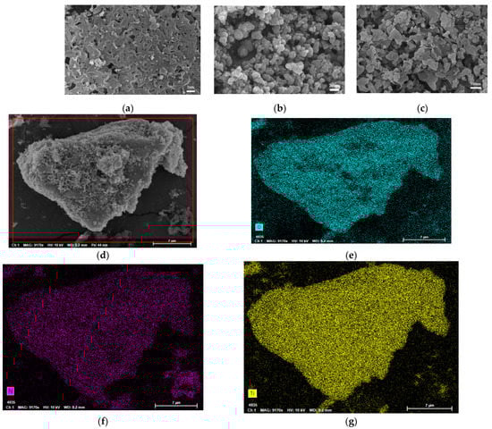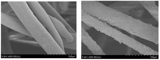 We washed the polyester fiber cotton (PET) with 1 mol/L of NaOH to remove the surface impurities, and then we dried and set it aside. Subsequently, 100 mg of catalyst was dissolved in water, the treated PET was added and shaken in a shaker for 30 min, and the water on the surface and the excess catalyst were drained before the catalyst was dried at 70 °C for later use. The PET scanning electron microscope results before and after catalyst loading are shown in Figure 12. We clearly observed that the photocatalytic materials werare evenly loaded on PET.