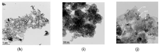 According to Figure 3a,h, CN was a curved and folded film with certain holes. As shown in Figure 3b,i, ART consisted of a particle with a uniform size but serious agglomeration, and Figure 3c shows that CN in ARTCN-0.5 was no longer a whole film but fragmented into many small pieces; thus, its position relative to ART could not be clearly observed. Combined with Figure 3d–g, we clearly observed that elements O, Ti, and N were evenly distributed in ARTCN-0.5. This showed that a composite material with a heterogeneous structure was synthesized. In addition, as clearly shown in Figure 3j, the ART agglomeration phenomenon was significantly improved after the improvement of CN, which indicated that the utilization of light by ART in the composite ARTCN-0.5 was further enhanced.
