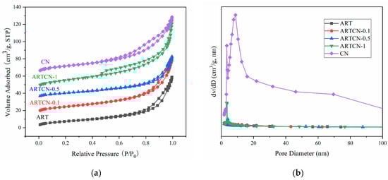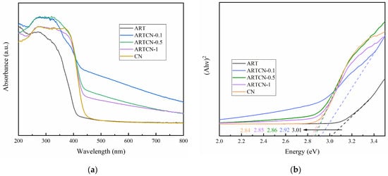 The optical absorption properties of the prepared samples were investigated via the UV–Vis absorption spectra, and the results are shown in Figure 5a. The optical absorption intensity of the ARTCN-X composite material improved by CN widened in the visible light range because the specific ART surface area improved as CN increased, and the agglomeration phenomenon also significantly improved. These results indicated that CN could effectively expand the optical absorption range of ART, thus improving the response and utilization efficiency of visible light. In addition, the band gap width of the prepared material was calculated with the Kubelka-Munk method [], as shown in Figure 5b. The bandgap widths of ART, ARTCN-0.1, ARTCN-0.5, ARTCN-1, and CN were 3.01, 2.92, 2.86, 2.85, and 2.84 eV, respectively. First, we clearly observed that the band gap width of ART was smaller than the 3.12 eV value reported in the literature, because heterostructures would form between the anatase phase TiO2 and rutile phase TiO2, enhancing the ability of photogenerated carrier separation []. Secondly, we found that with the increase in the CN content of the amendment, the band gap width of the composite ARTCN-X became significantly smaller than that of ART and approached that of CN, which was consistent with other studies [].