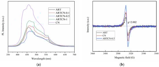 A PL spectrum can be used to study the separation of the photogenerated carriers in semiconductors, where the lower the peak intensity, the lower the recombination rate of the photogenerated carriers and the higher the photocatalytic activity []. As shown in Figure 6a, ARTCN-0.5 had the lowest peak intensity, indicating that its photocatalytic activity was the highest, which further indicated that as an amendment, the amount of CN addition did not follow the logic of “the more content the better” but had an appropriate ratio with ART. In addition, we observed that the wide wavelength range of ARTCN-X after CN modification in the interval of 451.8–468.8 nm was attributed to the oxygen vacancy that contained two captured electrons, which both promoted the formation of superoxide radicals (·O2−) and hydroxyl radicals (·OH) and was favorable for photocatalytic degradation.