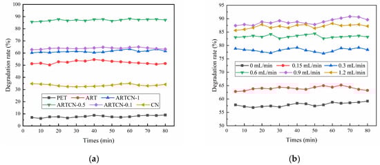 The initial concentration of ammonia was 50 mg/m3, and the flow rate of the moist air was 0.9 mL/min. Different catalysts were used to study their influence on the degradation of gaseous ammonia, and the results are shown in Figure 7a. This indicated that PET itself was not good at removing gaseous ammonia, and the average degradation rates of gaseous ammonia by ART, ARTCN-0.1, ARTCN-0.5, ARTCN-1, and CN were 52.35%, 61.43%, 88.86%, 63.90%, and 33.51%, respectively. These results indicated that the degradation performance of gaseous ammonia by the ARTCN-X composite catalyst modified by CN was improved, and the effect was most obvious when the amount of CN was 0.5 g because ARTCN-0.5 had the strongest photogenerated carrier separation ability.