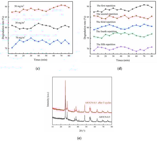 Figure 7e shows the XRD patterns of ARTCN-0.5 before and after repeated use (five times). We found that the crystal shape and structure of ARTCN-0.5 did not significantly change after five repeated uses, indicating that its properties were stable.