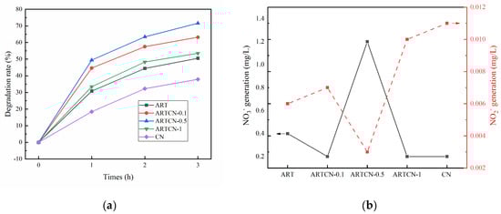 When pH > 10, NH4+ hydrolyzes in an alkaline solution and then exists in the form of NH3·H2O []. Therefore, we chose to adjust the pH of ammonia nitrogen to 10.1, and then we tested the concentration of ammonia nitrogen in the solution. We found that it decreased by 3.82% because a small amount of NH3·H2O escaped in the gaseous form. The degradation results of ammonia nitrogen by different catalysts are shown in Figure 8a, where the catalytic dose was 50 mg and the initial concentration of NH4+ was 100 mg/L. The degradation rates of liquid ammonia by ART, ARTCN-0.1, ARTCN-0.5, ARTCN-1, and CN after 3 h of reaction were 50.54%, 63.18%, 71.60%, 53.55%, and 37.91%, respectively, indicating that the degradation performance of the gaseous ammonia by the ARTCN-X composite catalyst after CN improvement was improved.