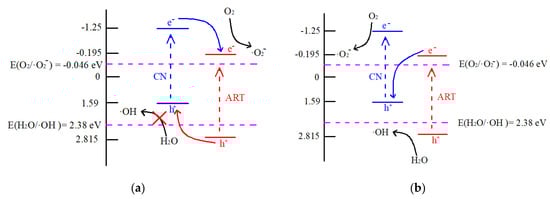 Two possibilities existed for the photocatalytic mechanism of the composite catalyst: (1) conventional type II heterojunctions and (2) Z-type heterojunctions []. Under simulated solar irradiation, ART and CN were excited and generated electron-hole pairs. If the type II heterojunction mechanism was followed, the photogenerated electrons in the conduction band of CN would be transferred to the conduction band of ART and the photogenerated holes in the valence band of ART would be transferred to the valence band of CN [], as shown in Figure 9a. However, the hole in the valence band of CN could not generate ·OH by reacting with H2O. This was because the valence band potential of CN (1.59 eV) was lower than the standard oxidation potential E (H2O/·OH) (2.38 eV) [], resulting in a decrease in ·OH content, which was inconsistent with the results shown in Figure 9b. If the charge transfer mechanism of the Z-type heterostructure was followed, the photogenerated electrons in the ART conduction band would transfer to the valence band of CN and combine with the photogenerated holes in the CN valence band. This would result in a reduction in electrons in ARTCN and the accumulation of electrons in the CN conduction band and holes in the ART valence band, which was why the content of ·O2− produced by CN shown in Figure 10a was higher than that of ARTCN. The holes that accumulated in the valence band of ART had strong oxidability and could directly degrade ammonia molecules. However, the Ec (−1.10 V) of CN was more negative than EO (O2/·O2−), and the electrons that accumulated in the conduction band of CN could react with O2 to generate ·O2−. This z-type heterostructure was more consistent with the characterization results of ESR (Figure 10).