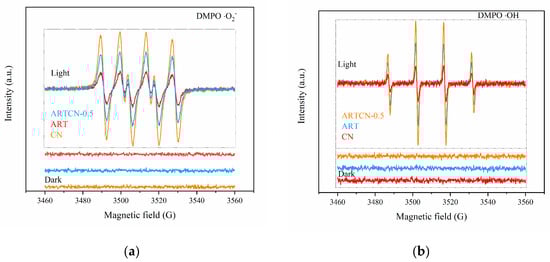 ESR was used to detect the types of free radicals in the catalysts under light, and then we explored their degradation mechanism of ammonia. As shown in Figure 10a,b, ART, CN, and ARTCN-0.5 did not produce free radicals in the absence of light, and superoxide free radicals (·O2−) and hydroxyl free radicals (·OH) were detected after light exposure. ·O2− and ·OH played decisive roles in the entire reaction []. The degradation mechanism was as follows. After gaseous ammonia combined with moist air, NH4+ was present as NH3·H2O under alkaline conditions. First, when the catalyst was illuminated, electrons and holes were generated []. The holes oxidized the water molecules on the surface of the catalyst, forming ·OH, while the electrons and dissolved oxygen underwent a series of reactions to form ·O2−, following Equations (4)–(6) []. ·OH and·O2− were the main active components in the photocatalytic reaction process, and they could rapidly oxidize the NH4+/NH3/NH3·H2O adsorbed on the surface of the catalyst []. Equations (9)–(13) show that ammonia was directly and completely oxidized to N2 [], and the NO3− and NO2− contents were very low after the reaction. Equations (12)–(16) show that ammonia was not completely oxidized to NO3− and NO2−, which was consistent with the research of Sun et al. [].