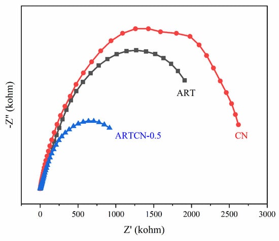 To further verify the accuracy of the above results, the test results of EIS are presented in Figure 11, which shows the impedance diagrams of ART, CN, and ARTCN. The electron transfer resistance in the sample was equivalent to the semicircle diameter on the EIS diagram, where the smaller the arc radius, the lower the charge transfer resistance of the composite sample []. Hence, due to the formation of the Z-type heterostructure, the charge-transfer resistance of ARTCN-0.5 was lower than ART and CN, which significantly improved the efficiency of photogenerated electron-hole migration and separation, which was consistent with the work of Y.Y. Wang [].