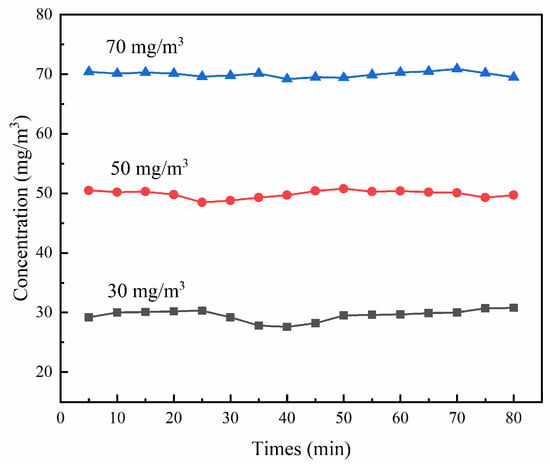 Figure 13 shows the device diagram for the photocatalytic degradation of gaseous ammonia. The light source consisted of a 300 W xenon lamp (30.2 mW/cm2), which was installed in a quartz water pipe with a condensation cycle to absorb the heat generated by illumination. Just below the xenon lamp was a photocatalytic quartz reaction tube, and PET loaded with the photocatalytic materials was placed in the tube. After exiting the cylinder, ammonia entered the reaction tube through a flowmeter. The different concentrations of standard ammonia (mixed with nitrogen) were 30 mg/m3, 50 mg/m3, and 70 mg/m3, with a flow rate of 100 mL/min, and the stability test results of the different concentrations of ammonia are shown in Figure 14. Air entered the photocatalytic reaction tube through the water, needle valve, and flowmeter in turn (moist air was the only source of oxygen). Ammonia was mixed with air at a certain humidity to simulate gaseous ammonia. After connecting each pipeline, the standard gas was ventilated to determine whether there was air leakage. The system was run for 10 min until it was stable, and the degradation efficiency of the gaseous ammonia in the entire process was η1 (Equation (17)):