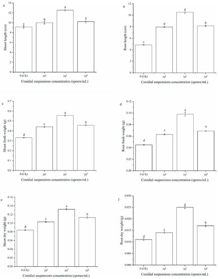 Effects of different concentration conidial suspensions of HT-1 strain on shoot length (a), root length (b), shoot fresh weight (c), root fresh weight (d), shoot dry weight (e), and root dry weight (f) of R. palmatum under greenhouse. Values are mean ± SD (n = 15 plants). Different letters above the bars indicate the differences are significant at p < 0.05.