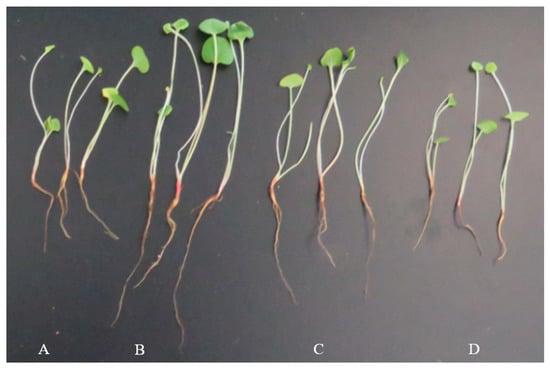 Effects of different concentration conidial suspensions of HT-1 strain on the growth of seedlings. Note: (A), seedlings treated with HT-1 strain at spore concentration of 106 spores/mL; (B), seedlings treated with the HT-1 strain at spore concentration of 107 spores/mL; (C), seedlings treated with HT-1 strain at spore concentration of 108 spores/mL; (D), CK (seedlings treated with distilled water).