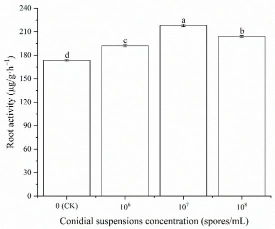 Effects of different concentration conidial suspensions of HT-1 strain on the root activity of R. palmatum. Values are mean ± SD (n = 15 plants). Different letters above the bars indicate the differences are significant at p < 0.05.