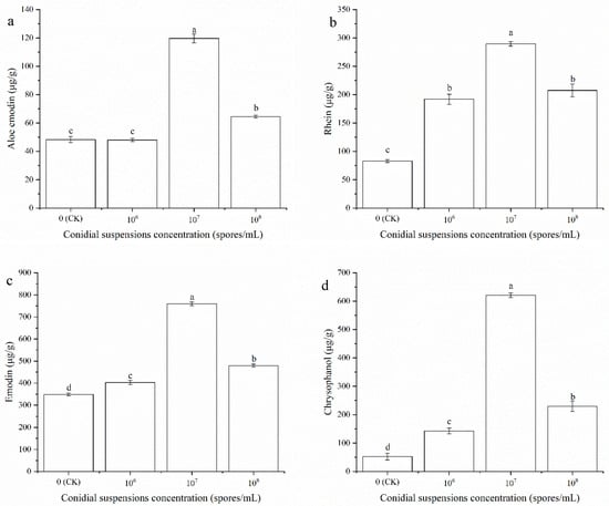 Effects of different concentration conidial suspensions HT-1 strain on metabolites accumulation in R. palmatum. (a) Aloe emodin; (b) Rhein; (c) Emodin; (d) Chrysophanol. Values are mean ± SD (n = 5 replicates). Different letters above the bars indicate the differences are significant at p < 0.05.
