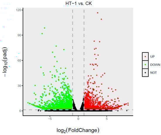 Volcano plots of differentially expressed genes. HT-1, R. palmatum roots from group the treated by 107 spores/mL HT-1 strain; CK, R. palmatum roots from the control group.