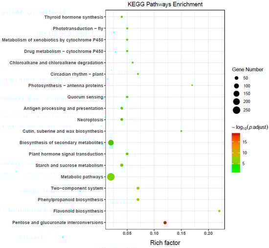 The KEGG pathway database includes information about molecular interactions in known metabolic and regulatory pathways. The KEGG database was used to perform enrichment analysis of the DEGs in the roots of R. palmatum; Figure 6 is a visual presentation of the KEGG enrichment analysis results. The degree of KEGG enrichment is measured by the Rich factor, p.adjust, and number of genes enriched in this pathway. The Rich factor refers to the ratio of the number of DEGs in the pathway to the total number of all annotated genes in the pathway. The larger the Rich factor, the greater the degree of enrichment. The p.adjust is the p-value after correction for multiple hypothesis testing. The more significant the enrichment, the smaller the value of −log10 (p.adjust). KEGG pathway enrichment analysis showed that DEGs were significantly matched in the KEGG database and were enriched in 241 pathways; the distribution of the DEGs in five major categories was performed using the KEGG database. Through analysis, we found that 26, 22, 134, and 17 genes, respectively, were enriched in the phenylpropanoid biosynthesis pathway, plant hormone signal transduction pathway, biosynthesis of secondary metabolites pathway, and plant–pathogen interaction pathways (Figure 6). Those pathways were related to growth, metabolite accumulation, and response to stress.