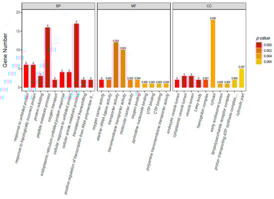 GO is an international standardized gene function classification system that describes the properties of genes and their products in any organism. The top 30 significant GO enrichment terms are displayed to evaluate the DEGs in terms of their predicted functions (Figure 7). The DEGs were assigned to three main GO categories: biological processes, cellular components, and molecular functions. In the biological process category, functions such as peptide metabolic process and cellular amide metabolic process were detected for the significant terms, along with multiple genes of both. In the cellular component category, functions such as transporter activity and transmembrane transporter activity were the significant terms, and the gene numbers of both were multiple. For the molecular functions category, cytosol was the most significant term, with multiple numbers of genes.