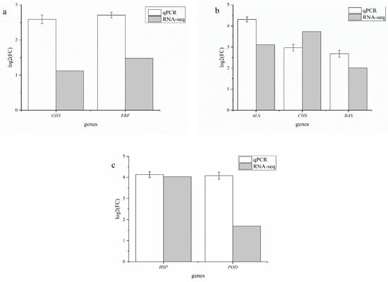 qRT-PCR is one of the important methods used to verify the gene expression level in RNA-seq. To verify the accuracy of the RNA-seq data, we selected some DEGs in R. palmatum for qRT-PCR (Table 2). The RNA-seq of R. palmatum was treated with 107 spores/mL; The HT-1 strain revealed that genes related to plant hormone transduction (Gretchen Hagen 3 (GH3) and ethylene response factor (ERF)) were upregulated by 1.13 times and 1.48 times, respectively, compared with the control, distilled water (CK). qRT-PCR showed that the expression of GH3 (TR2359_c0_g1) and ERF (TR6369_c0_g1) was upregulated by 2.59 and 2.71 times, respectively (Figure 8a). The gene expression trends that were demonstrated by qRT-PCR were consistent with those determined by RNA-seq. In RNA-seq, three genes (aloesone synthase (ALS), chalcone synthase (CHS), and benzalacetone synthase (BAS)) related to the biosynthesis of secondary metabolites were upregulated by 3.11, 3.73, and 2.01 times, respectively, compared with the CK. qRT-PCR indicated that the expressions of ALS (TR407_c0_g1), CHS (TR134901_c0_g1), and BAS (TR407_c2_g2) were upregulated by 4.31, 2.97, and 2.68 times, respectively (Figure 8b). The results of RNA-seq indicated that two genes related to plant–pathogen interaction and phenylpropanoid biosynthesis (heat shock protein (HSP) and peroxidase (POD)) were upregulated by 4.03 times and 1.69 times, respectively, compared with the CK. qRT-PCR indicated that the expression of HSP (TR61073_c0_g1) and POD (TR21_c0_g2) were upregulated by 4.13 and 4.08 times, respectively (Figure 8c).