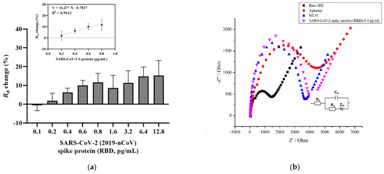 Figure 1a shows a concentration-dependent curve which shows an increasing trend in the charge transfer resistance percentage with increasing analyte concentration. The aptasensor results showed a linear increase for the concentrations between 0.2 and 0.8 pg/mL (Figure 1a, inset). The aptasensor results showed a linear regression, with an equation of y = 0.01647 × x − 0.7817, and a correlation coefficient of R2 = 0.9621 (* p < 0.05), where x is the concentration of the RBD S glycoprotein. The Randles equivalent circuit was used to fit the experimental data that included Rs, which is the solution resistance, the charge transfer resistance (Rct), the double layer capacitance (Cdl), and the Warburg impedance (Zw) (Figure 1b, inset). Figure 1b provides a representative Nyquist plot of each functionalization step that consists of a semicircle at high frequencies indicating the charge-transfer resistance and a vertical linear region that appears at the lower frequency ranges indicating diffusion resistance [57]. As can be seen, the cleaned bare surface of the IDE showed a small semicircle (Rct = 1191 Ω) compared with the diameter of the other semicircles. This indicates the rapid electron transfer of the ferri/ferrocyanide ions (Fe(CN)6]3−/4−) to the bare IDE surface. Upon immobilization of the aptamer and further overnight incubation with a blocking solution (MCH), the charge transfer resistance gradually increased to 3236 Ω and 3385.1 Ω, respectively. An increase in charge transfer resistance after immobilization of the aptamers indicates that negative electroactive ions of the redox buffer repel the negatively charged phosphate groups of the DNA aptamer, which confirms its attachment to the surface [35,44,58]. Finally, after 20 min incubation with 0.4 pg/mL of the target protein, the Rct increased to 3727 Ω. In the current study, the LOD for the SARS-CoV-2 S glycoprotein was found to be 0.4 pg/mL, which was calculated using the formula LOD = 3 × (Sa/b), where Sa is the standard deviation of the y-intercept, and b is the slope of the calibration curve [59]. This result, in combination with other findings, provides a contribution to the detection of the SARS-CoV-2 S glycoprotein (Table 1).