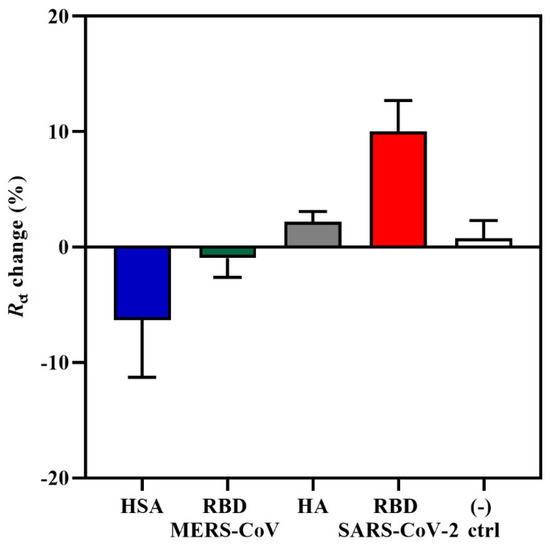 The specificity of the aptasensor was tested against three non-target proteins, such as the RBD domain of Middle East Respiratory Syndrome coronavirus (MERS-CoV) S glycoprotein, influenza hemagglutinin (HA) peptide, and human serum albumin (HSA) at a concentration of 0.6 pg/mL. This analysis was important for determining whether the increase in Rct response and change in the impedance spectra was due to the specific interaction between the CoV2-RBD-1C aptamer and the RBD S glycoprotein and not due to non-specific bindings. MERS-CoV and SARS-CoV-2 come from the same betacoronavirus genus; therefore, both have the S glycoprotein that plays a significant role in the viral pathogenesis [60]. HA is a surface glycoprotein of the influenza virus, which is responsible for recognizing the host receptor, and given the similarity of symptoms between COVID-19 and influenza [61], we tested HA in this specificity study. HSA is the most abundant protein in human plasma and is considered an important biomarker of many diseases [62]. The aptasensor was incubated with target and non-target proteins for 20 min, and further, the response was measured. As can be seen in Figure 2, non-target proteins resulted in the lowest responses in comparison with SARS-CoV-2 RBD S glycoprotein, showing a charge transfer resistance of −0.96%, 2.1%, and −6.32% for MERS S glycoprotein, HA, and HSA, respectively. The obtained responses from non-target proteins confirm the specificity of the aptasensor to the SARS-CoV-2 RBD S glycoprotein. Statistical analysis of the binding of the aptamer to the target and non-target proteins was performed by applying a one-way ANOVA with multiple comparisons (post hoc Tukey’s test), which showed that a significant difference was only observed between the RBD and HSA responses. Moreover, there was no increase in response for the negative control sample, where the IDE was incubated with the target protein that was previously functionalized for 4 h with only 0.01 M PBS (pH 7.4) and no aptamer on the surface. The signal showed an Rct change response of only 0.76%. The results of the current study support the findings of [33], where the aptasensor response towards non-target MERS-CoV S protein showed an Rct percentage change of only 7%, which is also lower compared with the sensitivity towards the target SARS-CoV-2 S glycoprotein.