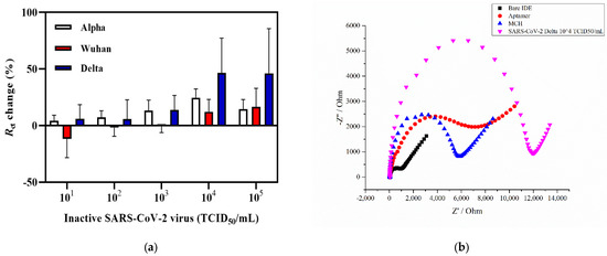 To detect the virus, three heat-inactivated SARS-CoV-2 variants, Wuhan, Alpha, and Delta, were serially diluted in 0.01 M PBS (pH 7.4) and were incubated on the IDE surface according to the protocol that was described above for the protein detection.