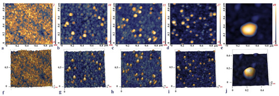 The surface topography of each IDE surface modification step was observed with the AFM, namely, the bare IDE, the aptamer functionalized, backfilled with MCH, with captured SARS-CoV-2 S glycoprotein, and a heat-inactivated SARS-CoV-2 Delta variant. (Figure 4a,f) shows that the bare IDE electrode has a grainy layer with a surface height of around 2–2.6 nm. This is in line with the published data, where the size of the bare Au surface was between 1.11 ± 0.03–4.9 nm and was characterized by a similar grainy surface [71,72,73]. Upon functionalization with the aptamer, the surface roughness increased up to 16.2 nm (Figure 4b,g). In the final step of incubation with the RBD S glycoprotein, the micrographs of the electrode with protein demonstrated a visible increase in height from 27 nm up to 34 nm (Figure 4d,i). These topography images of RBD S glycoprotein are consistent with those reported by [33], where binding of SARS-CoV-2 S glycoprotein and ssDNA aptamer with gold nanoparticles immobilized on SPCEs (screen-printed carbon electrodes) was analyzed.