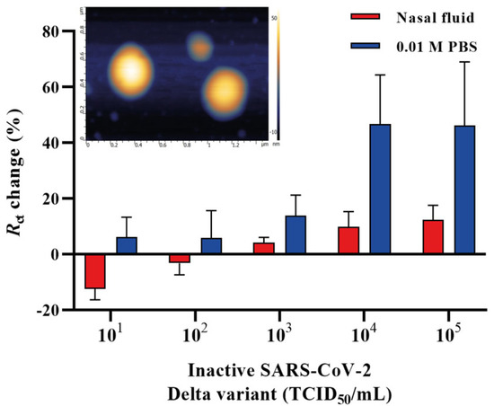 A concentration-dependent curve for the SARS-CoV-2 Delta variant spiked in nasal fluid and 0.01 M PBS (pH 7.4) detected by the EIS aptasensor. Inset: the AFM micrograph of SARS-CoV-2 Delta variant on a mica surface. Error bars show the mean of ± standard deviation and standard error (n = 3) for three measurements from 3 electrodes.