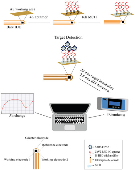 EIS has emerged as an effective and powerful technique for the study of the electrical properties occurring on the interface between the electrode and the immobilized aqueous solution. Impedimetric measurements are performed by applying the potential to the working electrode and measuring the changes in current, impedance, and charge transfer resistance after the binding of the target [37]. In this study, the thiolated aptamers were immobilized onto the IDE working surface. The workflow of the study is presented on Scheme 1. The sensitivity of the aptasensor was tested by measuring the different concentrations of the RBD S glycoprotein ranging from 0.1 pg/mL to 12.8 pg/mL with a 20 min incubation. The choice of the aptamer sequence was based on a previous study [42], where the aptamers with high binding affinity were selected towards the RBD region of SARS-CoV-2 S glycoprotein. We functionalized the aptamer sequence at the 5′-terminus with the addition of a thiol (-SH) C6 group and internal modifications of an 18-HEG spacer and 5-T residues. Internal modifications were included to create spacing between the aptamer sequence and the IDE surface and, therefore, ensure a better interaction with the target due to the upright orientation of the aptamer on the surface [49,50]. In addition, HEG residues (-OCH2CH2-) help to minimize steric hindrance, reduce the non-specific binding, and are considered to be sequence-neutral [51,52]. Thymine bases in the aptamer sequence were preferred over other nucleotides due to their ability to adsorb less strongly on a gold surface [53]. After aptamer immobilization, IDE was incubated with MCH which is commonly used for impedimetric measurements since it acts as a co-immobilizing agent that reduces non-specific interactions between the aptamer and gold surface and also provides a better orientation for the aptamer [54,55]. The final concentration of the modified aptamer used in this study was 1 μM based on the protocol developed by [56]; however, further research should be conducted to investigate the optimal aptamer density. This is important as the densely packed surface might prevent the effective binding of the protein to the aptamer [49].