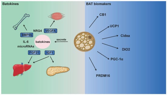 Although the aforementioned batokines are not BAT biomarkers, they make significant contributions to nutrient metabolism, immune system regulation and inflammatory response, serve as “crosstalk molecules” between BAT and other organs. Such crosstalk is likely to regulate energy expenditure and production across multiple systems and organs. While BAT landmark genes or batokines are also expressed in other tissues with high metabolic rates, the role of BAT in metabolic regulation has drawn great attention in recent years, and relative mechanisms can also be explained in these aspects [8,24]. BAT is not widely distributed in humans or animals, but the existence of these genes or factors does bring BAT into the metabolic regulation network of the whole body [25]. Figure 1 summarizes the main biomarkers of BAT and batokines that function between BAT and other organs.