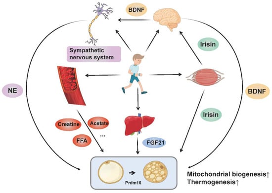 Collectively, BAT thermogenesis and adipose tissue browning may be adaptations to special physiological conditions, in order to sustain the balance between systematic energy supply and expenditure. Exercise regulates the browning and thermogenesis of adipose tissue through multiple organs (muscle, brain, liver and adipose tissue) and multiple pathways (nerve, endocrine and metabolic products), where the molecular mechanisms involved ultimately target thermogenic gene expression and mitochondrial biogenesis (Figure 2).