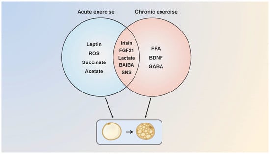 The possible molecular mechanisms of acute and chronic exercise that regulate adipose tissue browning. Acute and chronic exercise regulate the adipose tissue browning through a number of common and distinct molecular mechanisms. Acute exercise mediates browning through irisin, FGF21, leptin, lactate, ROS, succinate, SNS and acetate while chronic exercise possibly mediates through FGF21, SNS, FFA, BAIBA, BDNF, lactate and GABA. Some of the molecular mechanisms are speculative, as browning of adipose tissue has not been measured in the research. SNS, sympathetic nervous system.