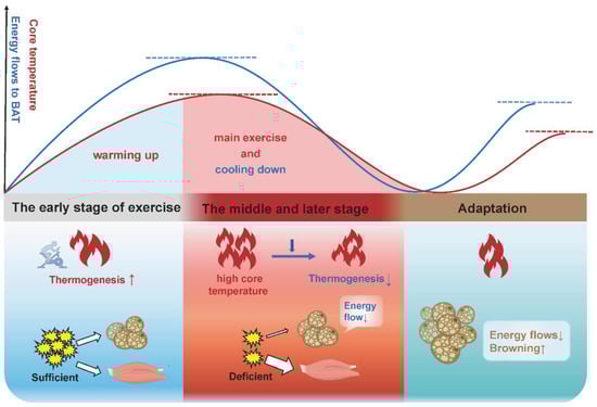 Here, we propose a possible explanation: BAT increases thermogenesis in the early stage of acute exercise and chronic exercise to consume energy and raise core temperature where an appropriate elevated body temperature is beneficial to promoting muscle strength, reducing the muscle viscosity and enhancing the activity of related enzymes, known as “warming up”, and finally accelerates the body to adapt to exercise. In the late stage of acute exercise with increased core temperature and depleted energy substrates, or in the late stage of chronic exercise training with the saving of energy substrates, BAT thermogenesis will be gradually lowered (Figure 4). This is consistent with the view of other authors that BAT activity will be turned down in response to a chronic higher core temperature [100]. It is interesting to note that these authors attribute the increased adipose tissue browning in other depots to a compensatory mechanism for decreased BAT function, given that rats showed a browning switch in subcutaneous depots, but this was accompanied with a reduced thermogenesis and a morphological transformation (whitening) in BAT following exercise [97].