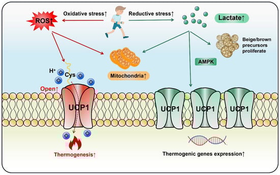 Both oxidative and reductive stress stimulate adipocytes’ thermogenesis and browning during exercise. In an oxidative stress state, ROS opens the UCP1 proton channel on the mitochondrial inner membrane to initiate thermogenesis by the thiol oxidation of UCP1 at cystine (Cys253). In a state of reductive stress, lactate as a reducing agent produced by exercise stimulates browning by up-regulating UCP1 expression through the AMPK pathway or directly promoting the proliferation of beige/brown precursor cells. In the exercise cycling of energy supply and expenditure (including one bout of exercise and chronic regular exercise), ROS initiates adipose thermogenesis immediately to compensate the daily energy expenditure, whereas lactate increases adipocytes mitochondrial biogenesis and browning through the adaptive up-regulation of UCP1.
