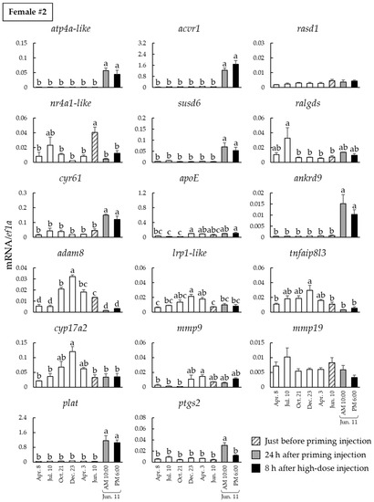 Seasonal changes of ovulation-related gene mRNA expression in the ovarian follicles of female #2. Expression levels of three follicles isolated on 8 April 2019, to 3 April 2020 (open column), just before LHRHa priming injection (hatched column), 24 h after priming injection (shaded column), and 8 h after high-dose injection (solid column) were administered. Data are presented as the mean values ± standard error of the mean (SEM), and different letters indicate significant differences set at p < 0.05.