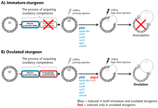 Estimated ovulation process in the Amur sturgeon. (A) In immature sturgeons, only plasmin-producing ability is acquired before the priming injection and then 7 ovulation-related genes (blue) were expressed after the priming injection. (B) In ovulated sturgeons, genes shown in red are induced after the priming injection, in addition to the genes shown in blue, because their ovarian follicles have the ability to synthesize prostaglandins even before the priming injection.