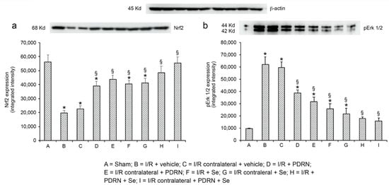 Representative Western blot analysis of Nrf2 (a) and pErk 1/2 (b) in testes of sham, I/R + vehicle, I/R contralateral + vehicle, I/R + PDRN, I/R contralateral + PDRN, I/R + Se, I/R contralateral + Se; I/R + Se + PDRN; I/R contralateral + Se + PDRN rats. * p ≤ 0.05 versus sham; § p ≤ 0.05 versus I/R. Bars represent the mean ± SD of seven experiments.