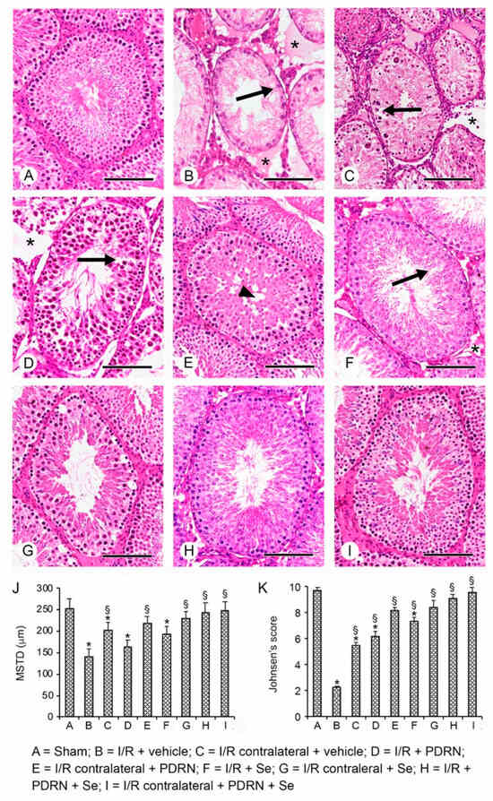 Histological findings in the seminiferous tubules of the different groups of rats (H&E stain). (A) Sham rats show normal morphology. (B) In I/R + vehicle rats, degenerative changes in the germinal cells (arrow) and edema of the extratubular compartment (*) are evident. (C) CL testes of I/R + vehicle rats show a germinal epithelium with only spermatogonia, isolated spermatocytes (arrow), and interstitial edema (*). (D) In the testes of I/R + PDRN rats, elongated spermatids are present in the germinal epithelium, even if some intercellular clefts (arrow) are evident; mild edema is demonstrated in the extratubular compartment (*). (E) The CL testes of the same group show a close-to-normal extratubular compartment and a germinal epithelium with isolated, empty zones in the basal position. (F) The testes of I/R + Se rats have tubules with peripheral spermatogonia and detached spermatocytes; the extratubular compartment is dilated (*). (G) CL testes of the same group show larger tubules, and their lumen is filled with round spermatids (arrowhead). (H,I) In the testes of I/R + PDRN + Se rats and the CL testes of the same group, no evident morphological changes are recognized in both the tubular and the extratubular compartments. (J) Histogram of the mean seminiferous tubule diameter (MSTD) in the different groups of rats (mean ± standard deviation). (K) Histogram of the Johnsen score in the different groups of rats (mean ± standard deviation). * p ≤ 0.05 versus sham group; § p ≤ 0.05 versus I/R rats (Scale bar: 100 µm).