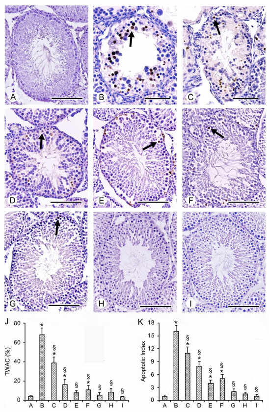 Assessment of apoptosis in the different groups of rat testes with TUNEL stain. (A) In the testes of all sham rats, no TUNEL-positive cells were present. (B,C) Many TUNEL-positive cells (arrow) were seen in the wall of the seminiferous tubules of I/R + vehicle rats and in CL testes of the same group. (D,E) In I/R + PDRN alone-treated rats and in the CL testes of the same group, TUNEL-positive cells (arrow) were decreased when compared with I/R rats. (F,G) In I/R + Se-treated rats and in CL testes of the same group, only isolated TUNEL-positive cells were present. (H,I) In I/R rats treated with the association PDRN + Se, in both operated and CL testes, only rarely isolated TUNEL-positive germ cells were observed. (J) Tubules with apoptotic cells (TWAC) (expressed in %) in the different groups of rats. (K) Apoptotic index values (apoptotic cells/tubule) in the different groups of rats. * p ≤ 0.05 versus sham group; § p ≤ 0.05 versus I/R rats (scale bar: (A,D–I) = 100 μm; (B,C) = 50 μm).