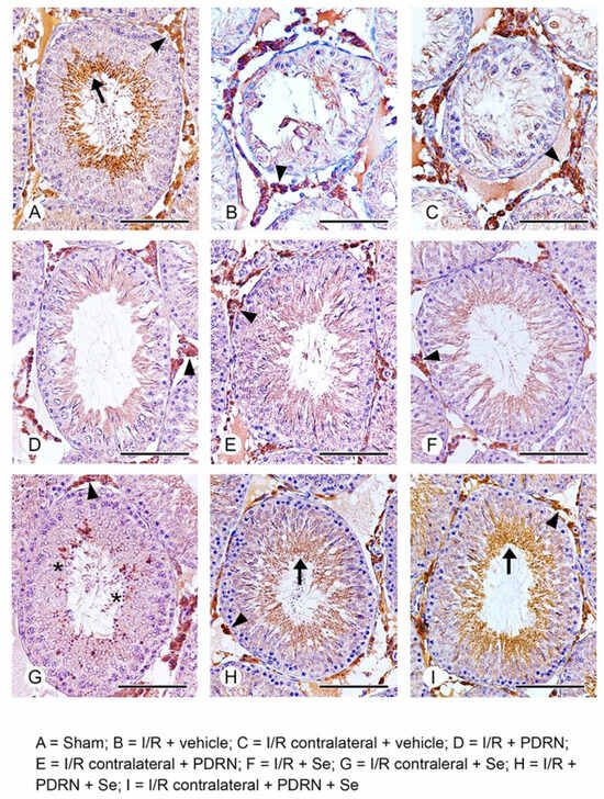 Immunohistochemical expression of HIF-1α in the testes. (A) In sham groups, HIF-1α positive elongated spermatids and spermatozoa (arrow) and Leydig cells (arrowhead) are present. (B,C) In both operated and CL testes of I/R + vehicle rats, no HIF-1α positive cells are evident in the highly damaged tubular wall; interstitial Leydig cells (arrowhead) show a higher expression versus sham rats. (D) In the operated testes of I/R + PDRN-treated rats, a moderate positivity for HIF-1α of the tails of spermatozoa (arrow) and Leydig cells (arrowhead) is evident. (E) In CL testes of I/R + PDRN-treated rats, isolated HIF-1α positive spermatocytes and spermatids (asterisk) are present in the seminiferous epithelium, in addition to Leydig cells (arrowhead). (F,G) In both operated and CL testes of I/R + Se-treated rats, no HIF-1α positive cells are present in the otherwise improved structure of seminiferous tubules; the expression of Leydig cells (arrowhead) is reduced when compared with I/R rats. (H,I) In the seminiferous tubules of both operated and CL testes of I/R + PDRN + Se-treated rats, an evident positivity for HIF-1α of the tails of spermatozoa (arrow) and Leydig cells (arrowhead) similar to sham is present. (Scale bar: (A,D–I) = 100 µm; (B,C) = 50 µm).