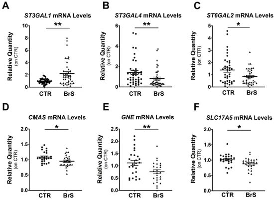 Real-time PCR analysis of ST3Gal1, ST3Gal4, ST6Gal2, ST8Sia2, and ST8Sia5 was performed on mRNAs extracted from PBMCS of BrS patients (BrS) and compared with those from healthy controls (CTR). ST3Gal1 showed a 2-fold increase, respectively, in BrS compared with CTR (Figure 1A), whereas ST3Gal1 and ST6Gal2 showed a 2- and 1.7-fold decrease, respectively (Figure 1B,C). ST8Sia4 and ST8Sia5 mRNAs could not be detected in PBMCs (data not shown). Real-Time PCR analysis of CMAS, GNE, and SLC17A, key genes of the sialic acid biosynthetic pathway, showed 1.2-, 2-, and 1.3-fold downregulation, respectively, in BrS patients compared with CTR (Figure 1D–F).