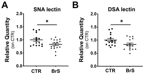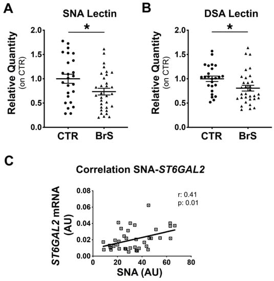 To assess the overall sialylation status of PBMC membrane proteins, flow cytometric analysis was performed using SNA and DSA lectins that specifically detect sialylated and desialylated proteins, respectively, as described in the Methods section. Results showed a 25% decrease in protein sialylation (Figure 2A) and a 15% decrease in protein desialylation (Figure 2B) in PBMCs from BrS compared with CTR. A positive association was observed between ST6Gal2 gene expression and sialylated protein levels (Figure 2C), with a Pearson coefficient of 0.41 and a p-value of 0.01.
