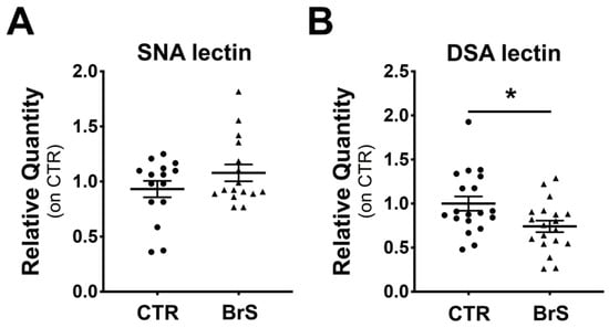 Plasma proteins showed a reduction in desialylation in BrS patients. Sialylation and desialylation status of the plasma proteins was analyzed through Western Blot followed by incubation with SNA and DSA lectins, respectively. (A) Total plasma sialylation levels. (B) Total plasma desialylation levels. CTR: N = 19, BrS: N = 19. Data represent the median ± SEM and are expressed as relative amounts compared with healthy controls. Each dot and triangles in the graphs represent a single healthy control and a single BrS patient, respectively. Statistical significance was determined by Student’s t-test. * p < 0.05.