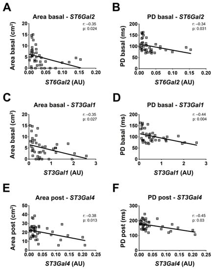 Sialyltransferases mRNA levels are correlated with BrS clinical features. The correlation between sialyltransferases gene expression and clinical features was analyzed by comparing the RNA expression levels of ST6Gal2, ST3Gal1, and ST3Gal4 with different clinical characteristics of BrS patients. Correlation between ST6Gal2 mRNA levels and basal pathological substrate area (A) and PD (B). Correlation between ST3Gal2 mRNA levels and basal pathological substrate area (C) and PD (D). Correlation between ST3Gal4 mRNA levels and post-ajmaline pathological substrate area (E) and PD (F). BrS: N = 41. Each square in the graphs represent a single BrS patient. The statistical significance of the correlation was evaluated using the Pearson’s r coefficient and the p value.