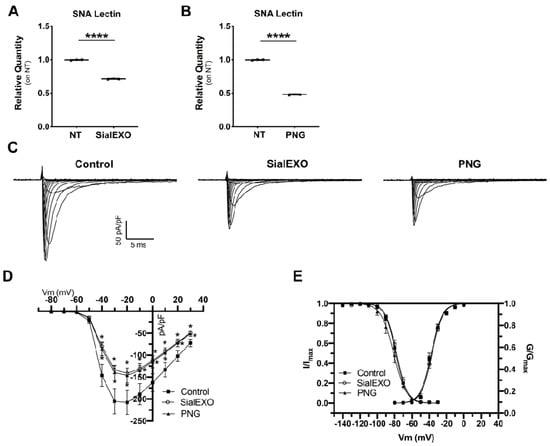 To study the effects of sialic acid alterations on sodium currents, HEK293A overexpressing NaV1.5 sodium channel were treated with SialEXO and PNGase (PNG) to specifically remove sialic acid and N-glycans, respectively. Flow cytometry analysis showed a significant 1.3- (for SialEXO) and 1.5-fold (for PNG) decrease of membrane sialylated proteins (Figure 7A,B). Patch clamp experiments revealed that the incubation with SialEXO and PNG produced a significant INa density reduction (Figure 7C). In particular, INa peak density at −20 mV was 207.9 ± 27.4 pA/pF in control (n = 15), −141.4 ± 7.5 pA/pF pA/pF (n = 24) and −146.3 ± 17.0 pA/pF (n = 14) after 6 h in the presence of SialEXO and PNG, respectively (Figure 7D,E). No significant changes were observed in the conductance curves; the fitting of the curves with a Boltzmann function yield a voltage of half activation (V1/2) values of −37.6 ± 0.6 mV (slope 6.3 ± 0.5), −36.8 ± 0.4 mV (slope 6.2 ± 0.4) and −38.0 ± 0.5 mV (slope 6.2 ± 0.4) for control, SialEXO and PNG, respectively (Figure 7C). In a similar fashion, no significant changes were seen in the voltage dependence of steady-state inactivation. In this case, the V1/2 values were −78.6 ± 1.2 mV (slope 5.3 ± 0.1), −77.8 ± 1.1 mV (slope 5.2 ± 0.1) and −81.4 ± 2.1 mV (slope 5.3 ± 0.1) for the three conditions tested (Figure 7C).
