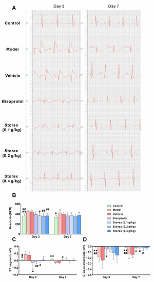 Electrocardiograms were collected on day 3 and day 7. As shown in Figure 2A–D, on day 3, compared with the control group, the heart rate (HR) of the model group was significantly increased, the ST segment was significantly elevated and a deep Q-wave was formed, suggesting that the rats developed AMI after ISO injection. Compared with the model group, there was no significant difference in the physiological signal of the vehicle group, and the bisoprolol group could significantly reduce the heart rate, lower the ST-segment wave amplitude and inhibit the Q-wave deepening on day 7 and also significantly reduce the ST-segment wave amplitude on day 3. Compared with the vehicle group, all three dose groups of storax significantly slowed down the heart rate, reduced the ST-segment amplitude and inhibited the Q-wave deepening in rats on day 3. On day 7, the storax 0.1 and 0.2 g/kg groups could suppress Q-wave deepening.