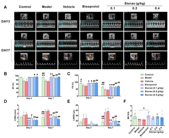 Effect of storax on cardiac function in ISO-induced AMI rats. (A) Representative images of M-mode echocardiography and mitral pulse Doppler. (B) Ejection fraction (EF). (C) Shortening fraction (FS). (D) Left ventricular end-systolic inner diameters (LVIDs). (E) Left ventricular end-systolic volume (LVESV). (F) MV E/A. Results are presented as mean ± SD (n = 6). One-way ANOVA followed by Bonferroni’s post hoc test: * p < 0.05, ** p < 0.01 vs. model group; # p < 0.05, ## p < 0.01 vs. vehicle group.