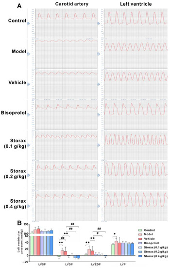 Effect of storax on hemodynamics in ISO-induced AMI rats. (A) Representative images of hemodynamics. (B) Quantitative analysis of left ventricular pressure: left ventricular systolic blood pressure (LVSP), left ventricular diastolic pressure (LVDP), left ventricular end-diastolic pressure (LVEDP), left ventricular pressure (LVP). (C) Quantitative analysis of ±dp/dtmax. (D) Quantitative analysis of left ventricular myocardial contractile component measured maximum shortening velocity (Vmax). (E) Quantitative analysis of left ventricular pressure drop time (T). (F) Quantitative analysis of arterial pressure: mean arterial pressure (MAP), systolic blood pressure (SBP), diastolic blood pressure (DBP). Results are presented as mean ± SD (n = 6). One-way ANOVA followed by Bonferroni’s post hoc test: * p < 0.05, ** p < 0.01 vs. model group; # p < 0.05, ## p < 0.01 vs. vehicle group.