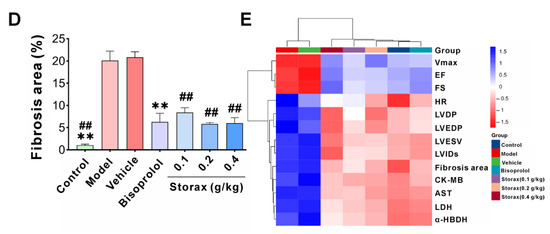 Masson staining was used to investigate the changes in collagen content of myocardial tissue; the blue area was collagen fibrous tissue and the red area was cardiomyocytes, fibroblasts and erythrocytes; the results are shown in Figure 5C,D. Compared with the control group, a large blue-stained area was observed in the myocardial tissue of rats in the model group, which showed proliferation of reticular fibrous connective tissue, suggesting that the myocardial tissue of rats in the model group showed obvious fibrosis. The vehicle group was similar to the model group. The blue-stained area in the myocardial tissue of rats in the three dose groups of storax as well as the bisoprolol group was significantly reduced.