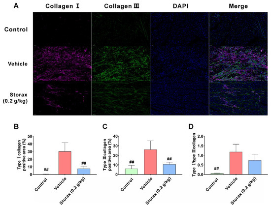 To elucidate the mechanism of storax on myocardial fibrosis, immunohistofluorescence was used to detect the expression of type I and III collagen in myocardial tissue. Compared with the control group, the deposition of type I and collagen in the vehicle group increased significantly, and the ratio of type I collagen to type III collagen also increased, suggesting that type I collagen synthesis was more obvious than type III collagen. Compared with the vehicle group, the storax 0.2 g/kg group could significantly reduce expression of type I and type III collagen, and there was a tendency to decrease the ratio of type I to III collagen (Figure 6A,B).